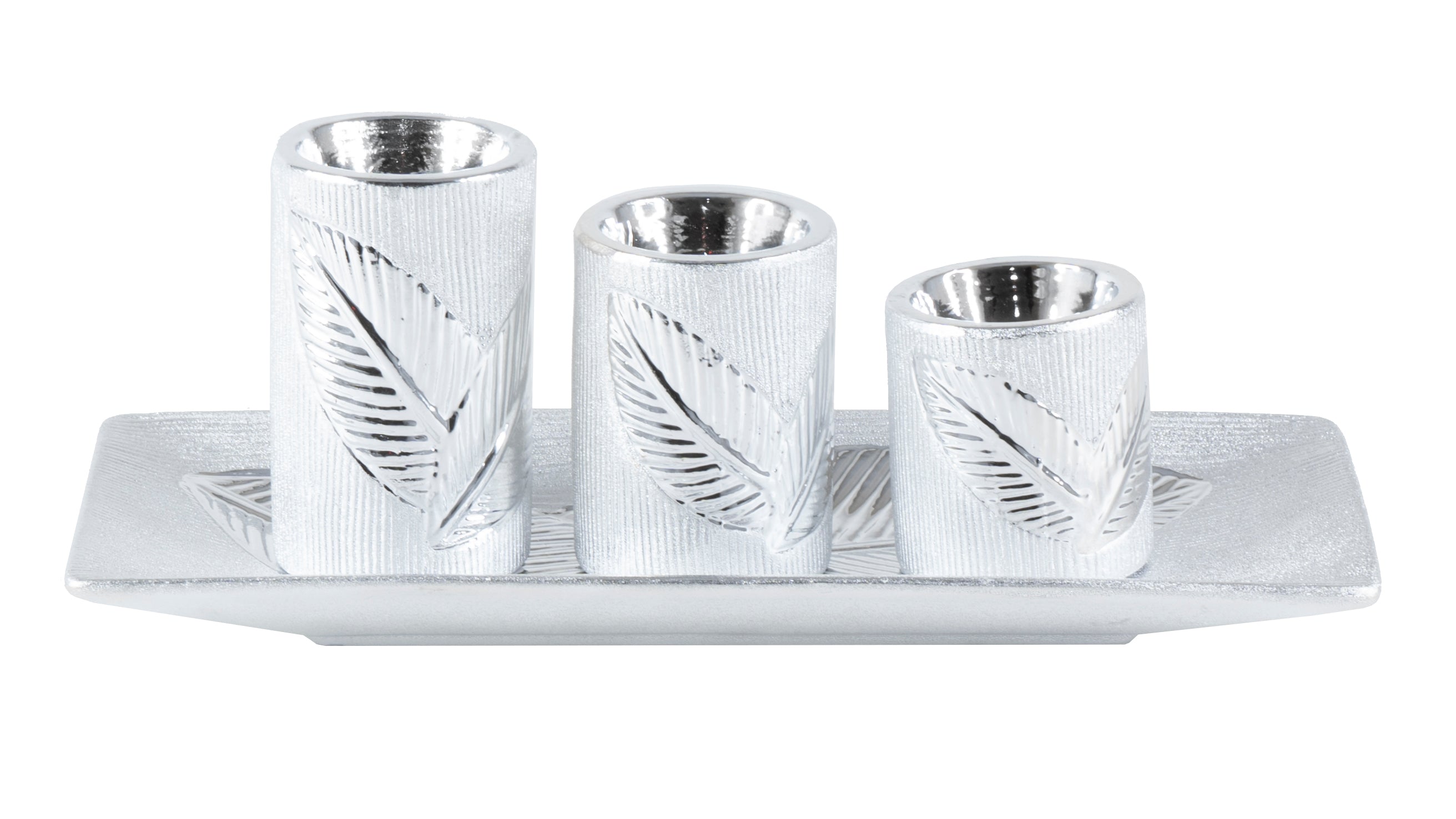 Candles can set a cozy or romantic mood in your home. Be sure to have this marvelous silver candle holder set. The silver leaf accents give it an elegant and modern feel. Ideal for center or corner tables. This candle holder set is crafted from fine quality ceramic material with a silver finish.