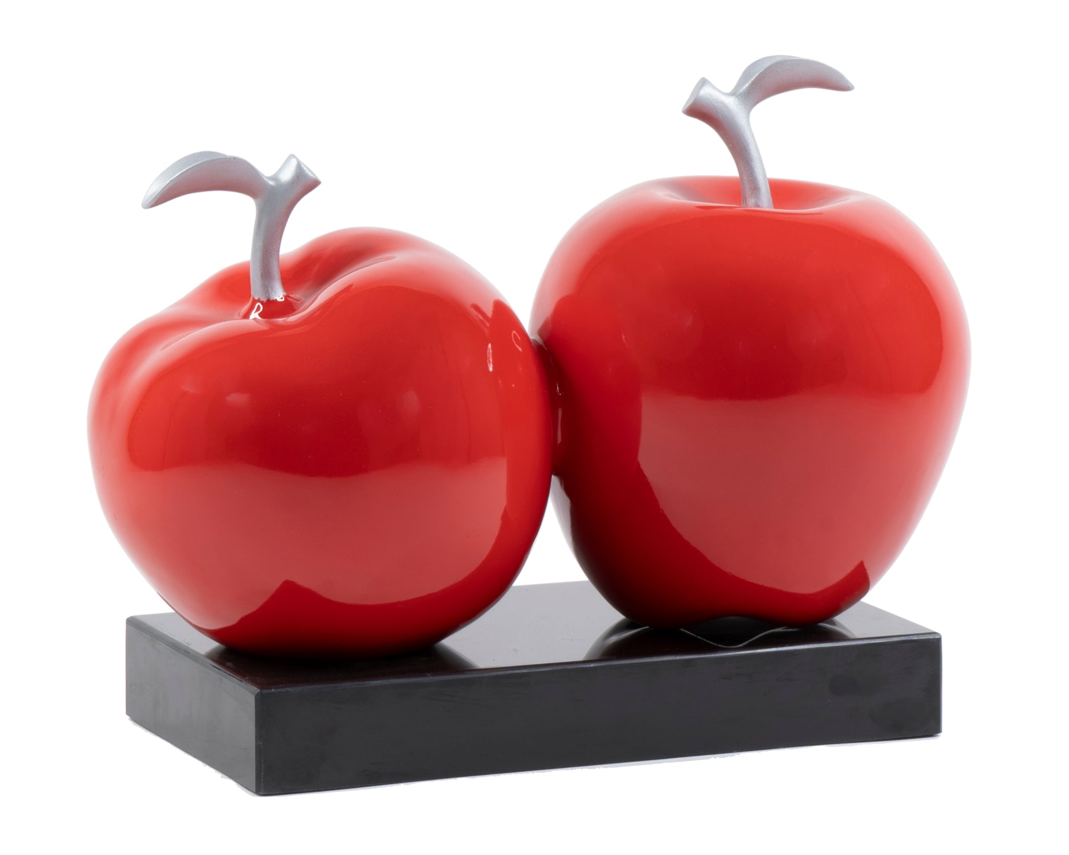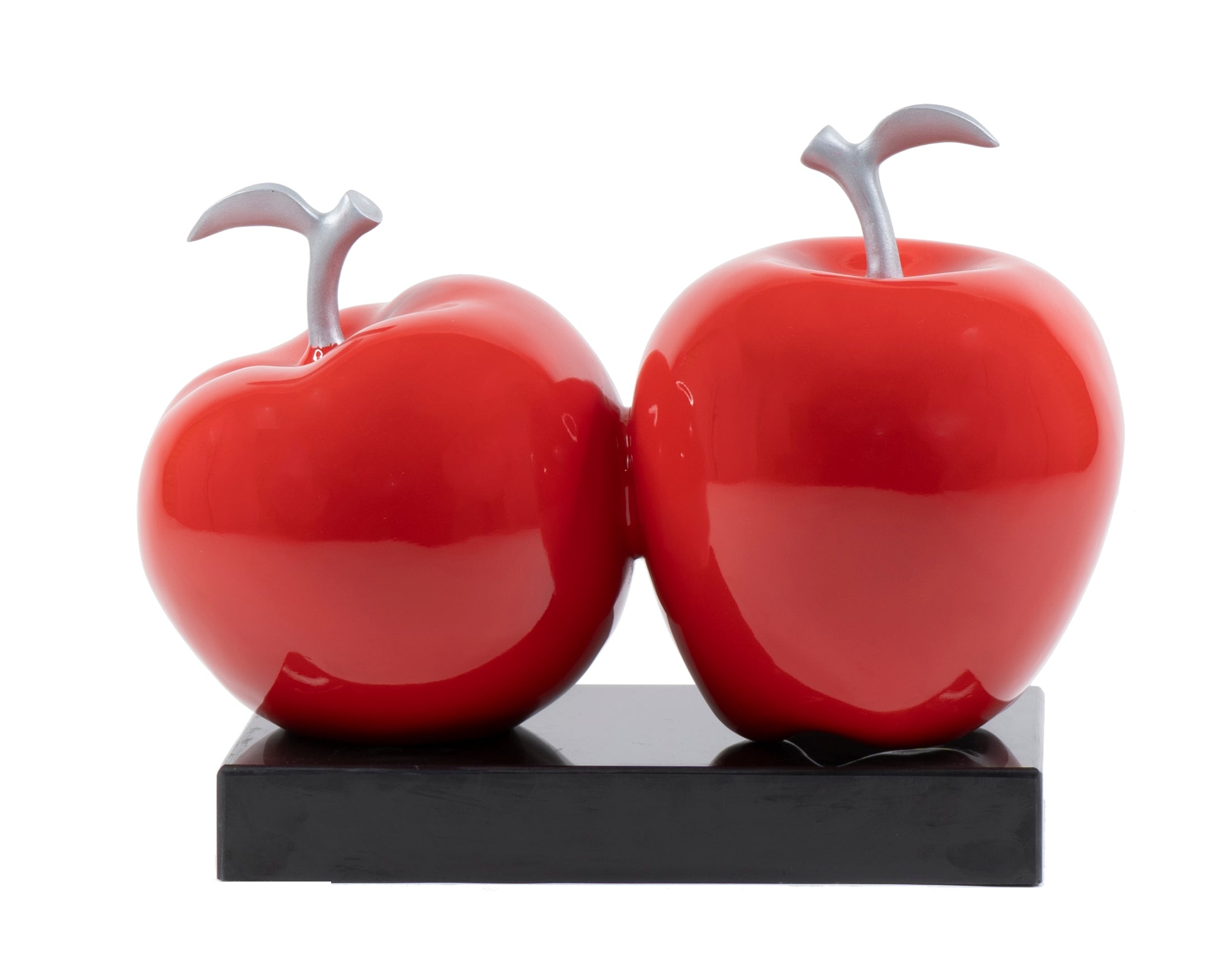 This classic apple sculpture portrays health. Two apples placed side by side are a wonderful center piece for any dining table or kitchen countertop. Fabricated from the highest quality polystone materials and finished with a gloss white, red or green coat on a wood base.