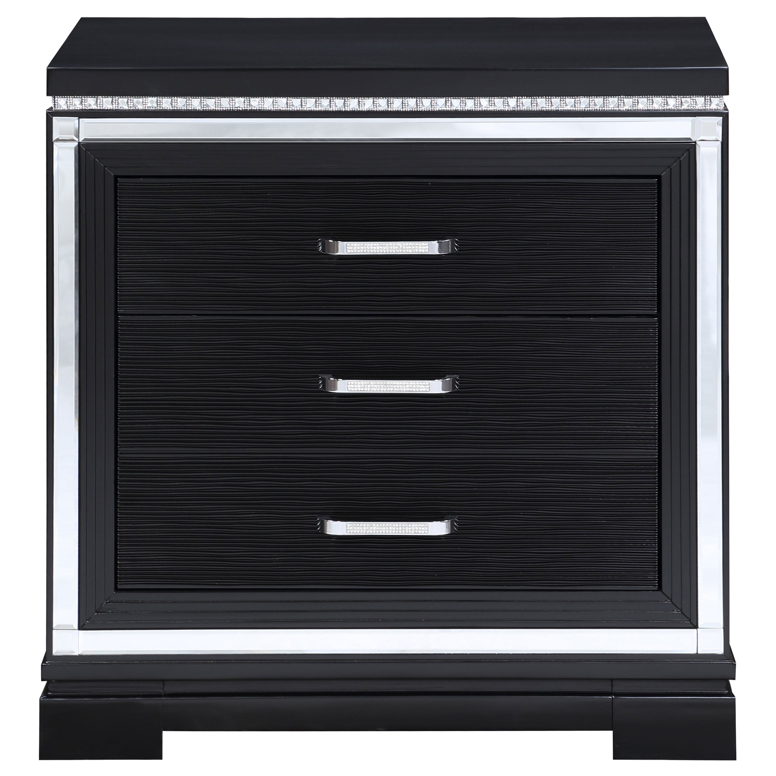 Bold, dramatic hues set the stage for clean lines and luxe details in this glam nightstand. Glimmering accents such as polished mirror trim create a border around the stacked drawers, capped with corner mirror tiles. A dark black finish offsets the polished and sparkling accents, while offering modern sensibilities like USB charging ports and a felt-lined top drawer for delicates. Along the drawer fronts is a wood grain surface that adds a hint of texture. Along the tabletop surface is a crystal-like border, mirrored also in the sleek hardware pulls.
