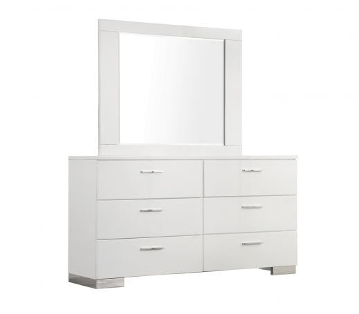 Add ambiance to a dressing area of bedroom with this modern vanity mirror. LED lighting offers a cool under glow tucked between a dual framed mirror. Covered in a polished, glossy white finish throughout, this glam mirror lends a stunning, chic display set atop a matching dresser. Clean lines and a rectangular shape provide an unobscured, wide reflective surface to assist makeup applications, hair styling and so much more. With its neutral white tone, it can complement many bedrooms' existing color palettes.