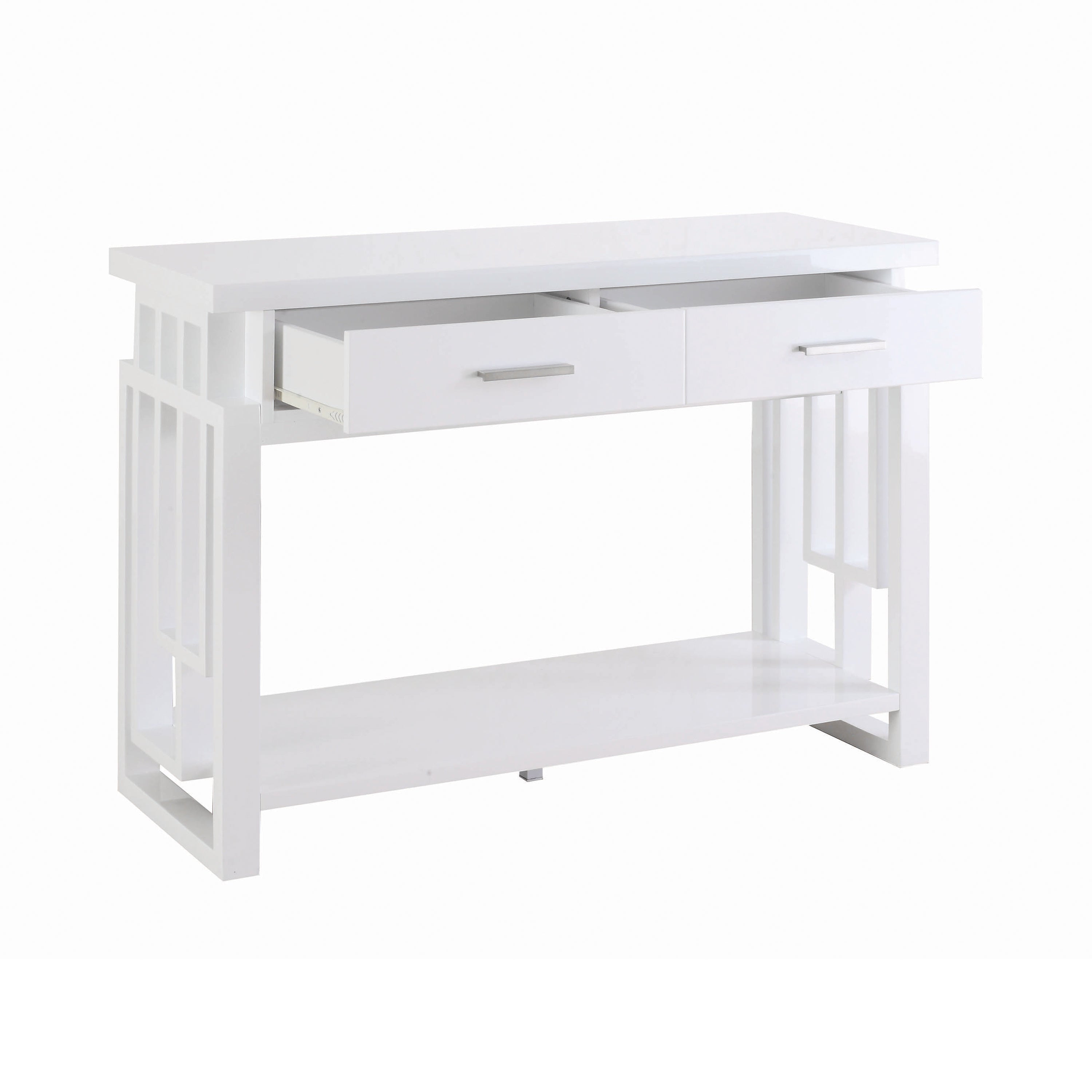 Complete a country chic scheme with the soft hue and delicate silhouette of this white sofa table. Open geometric shapes intertwine to create a warm, classic feel along the sides of the legs. Complete with two drawers and a built-in shelf, this sofa table features interesting curves and subtle metallic hardware. Showcase a family photo shoot or framed artwork along the elongated top and shelf. The high glossy finish adds a stylish sheen that updates the soft shapes.