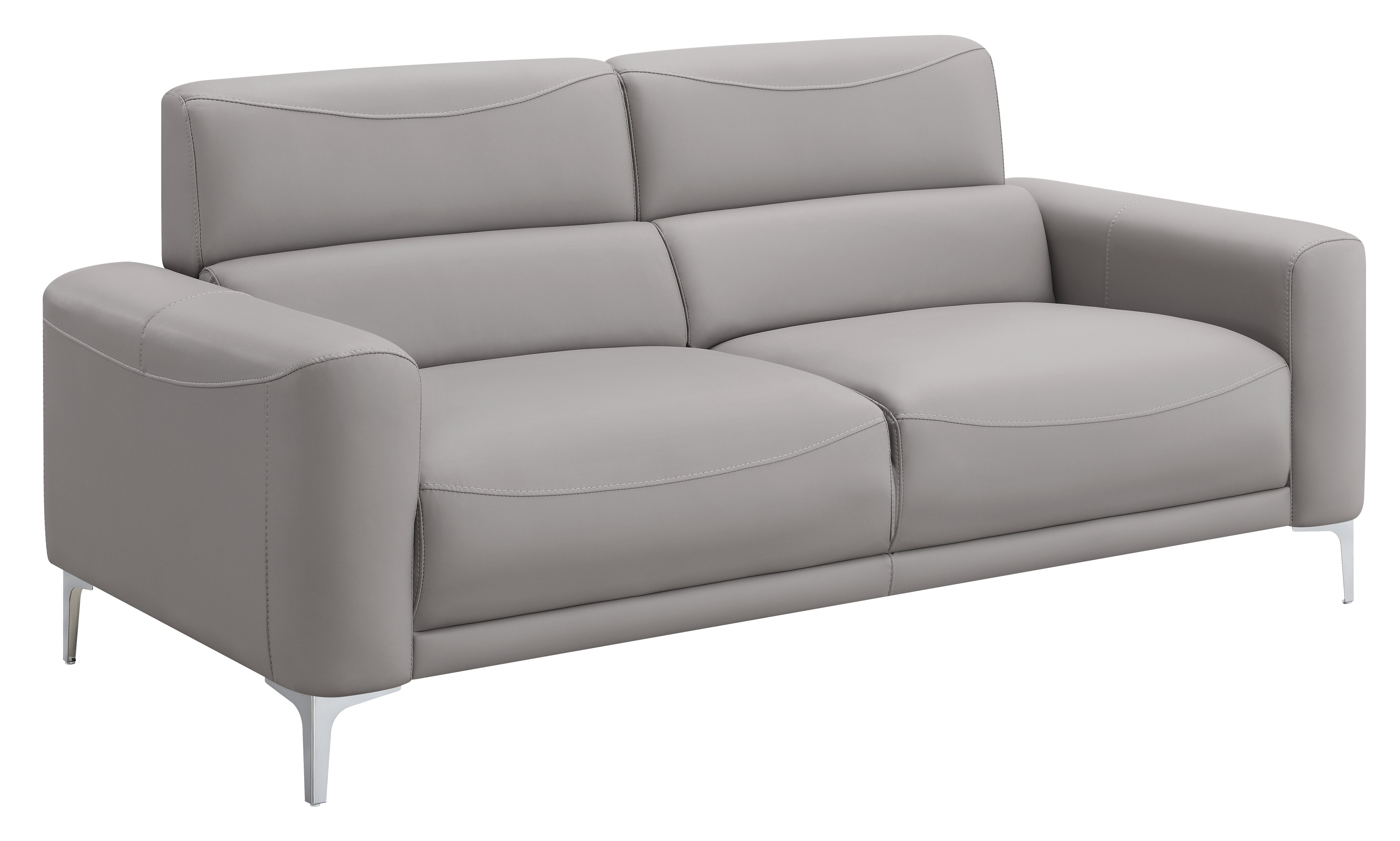With a soft taupe leatherette upholstery, this contemporary style sofa offers a modern flair. A clean line silhouette and all-around soft curves of seats and backrests offer an elegant edge. In addition, accents and small details such as top stitching and silver metal bracket legs add a striking touch. Rest comfortably against a tall attached backrest and seat cushions and unwind with family or entertain guests. Constructed of a solid wood frame, this sofa is designed for heavy use and offers a sturdy seating for two people.