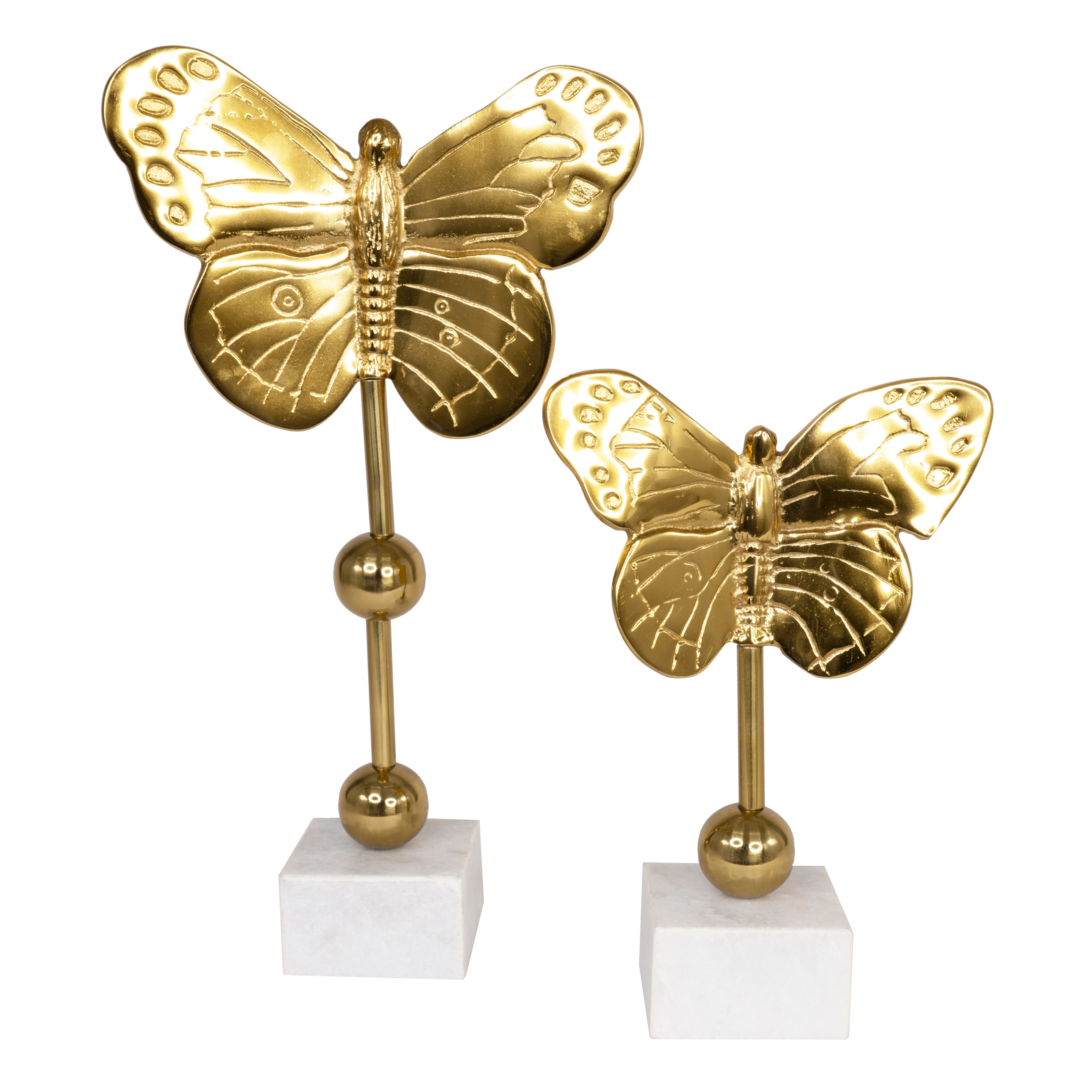 Elevate your home decor with our 2pc modern butterfly sculpture. Made with high-quality materials, these sculptures feature intricate details and are mounted on a luxurious marble base. Add a touch of elegance to any room with this beautiful tabletop decor. Perfect for butterfly lovers and art enthusiasts alike.