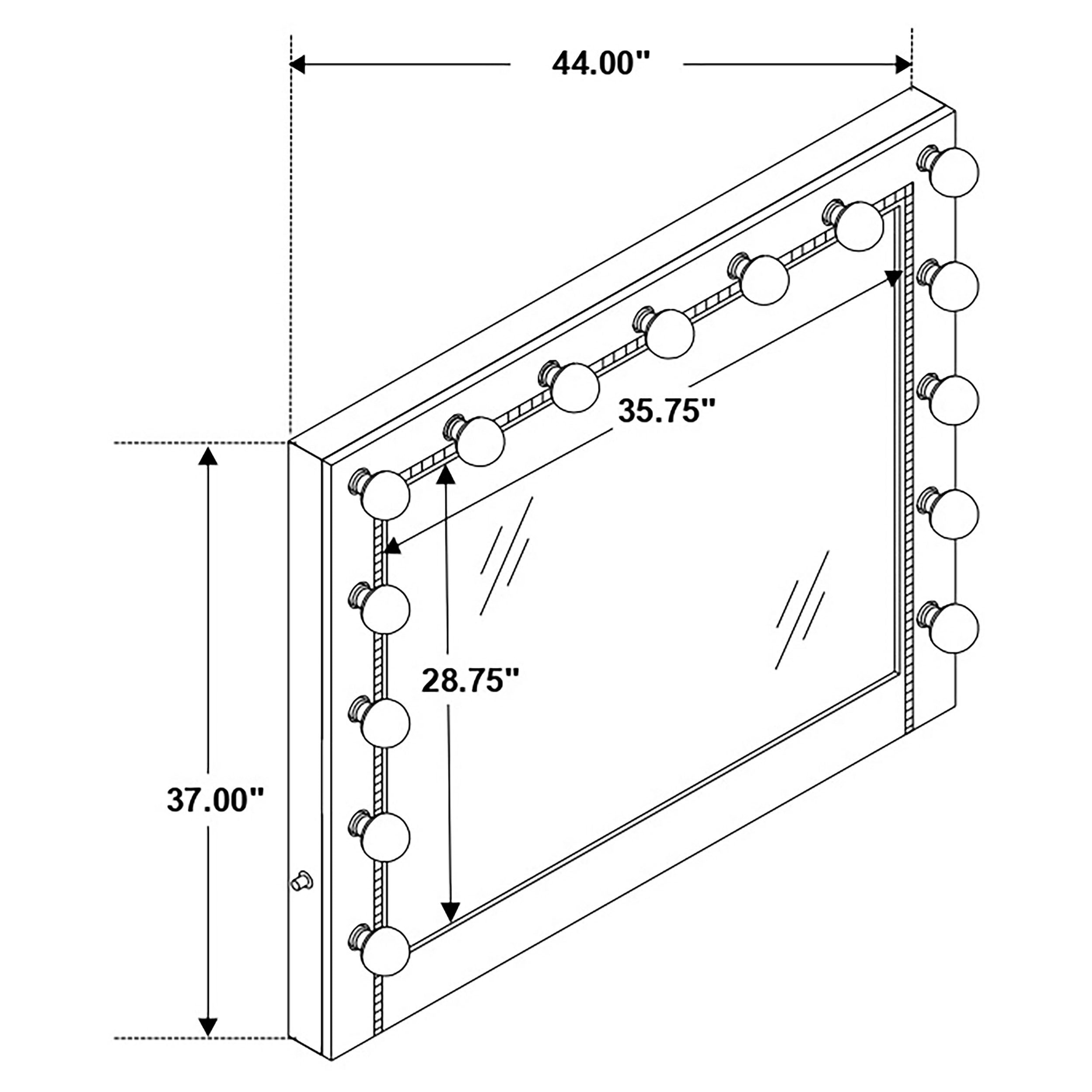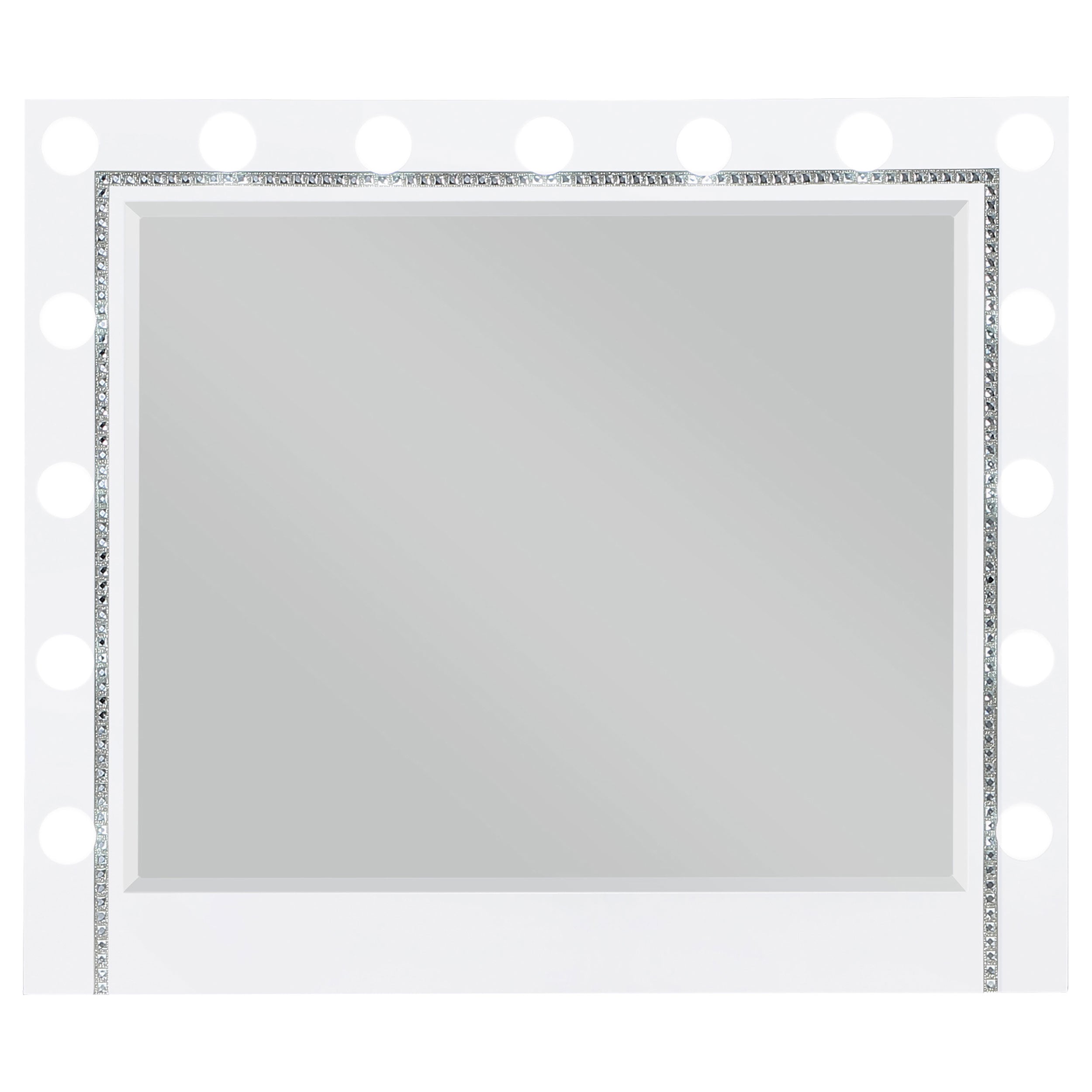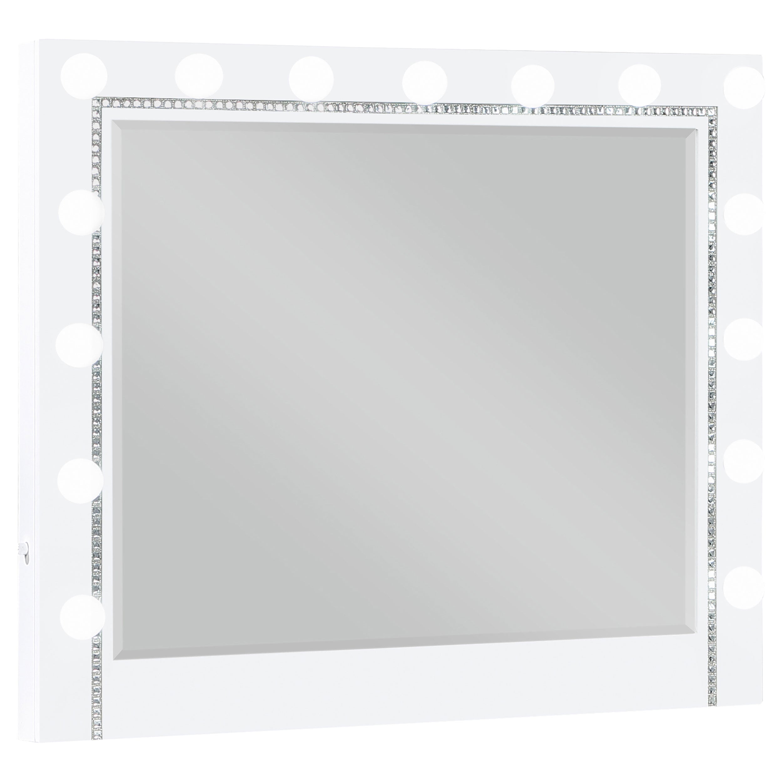 Beautiful and functional, this glamorous vanity mirror invites you to apply cosmetics, style your hair and more. Featuring a wide frame, this mirror lends itself to a variety of color palettes. Prepare for your day or evening with the even glow, surrounded by a generous 15 bulbs to create an even glow. Coordinating with the rest of the Eleanor bedroom collection, this Hollywood mirror can be situated upon a matching dresser that reflects the same crystal-like mirror tile insert that this stunning framed mirror provides. Completing the timeless glam style of this essential bedroom furniture piece is a beveled mirror that lends a classic touch.