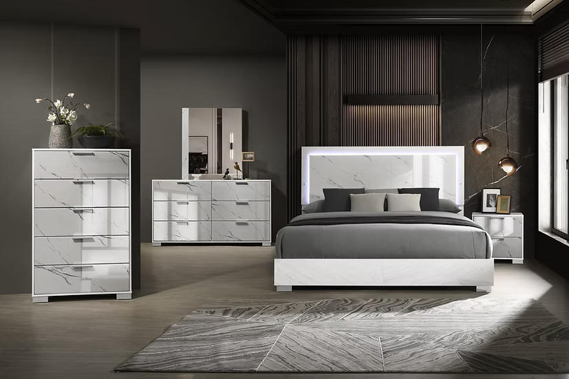 - Two-Tone High-Gloss Marble and Lacquer Finish: The luxurious marble-patterned surfaces on the bed, dresser, nightstand, and chest elevate the overall aesthetic.