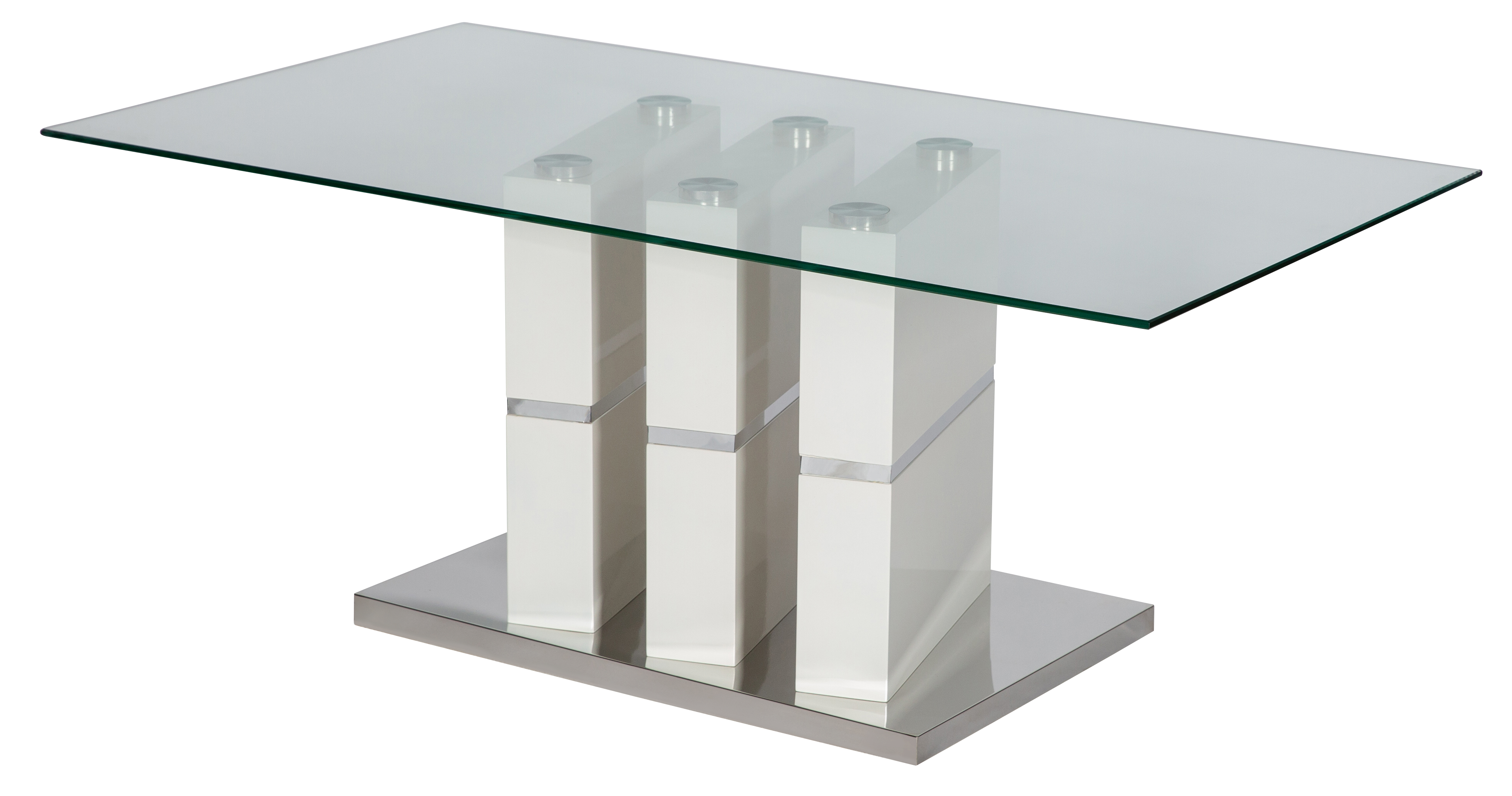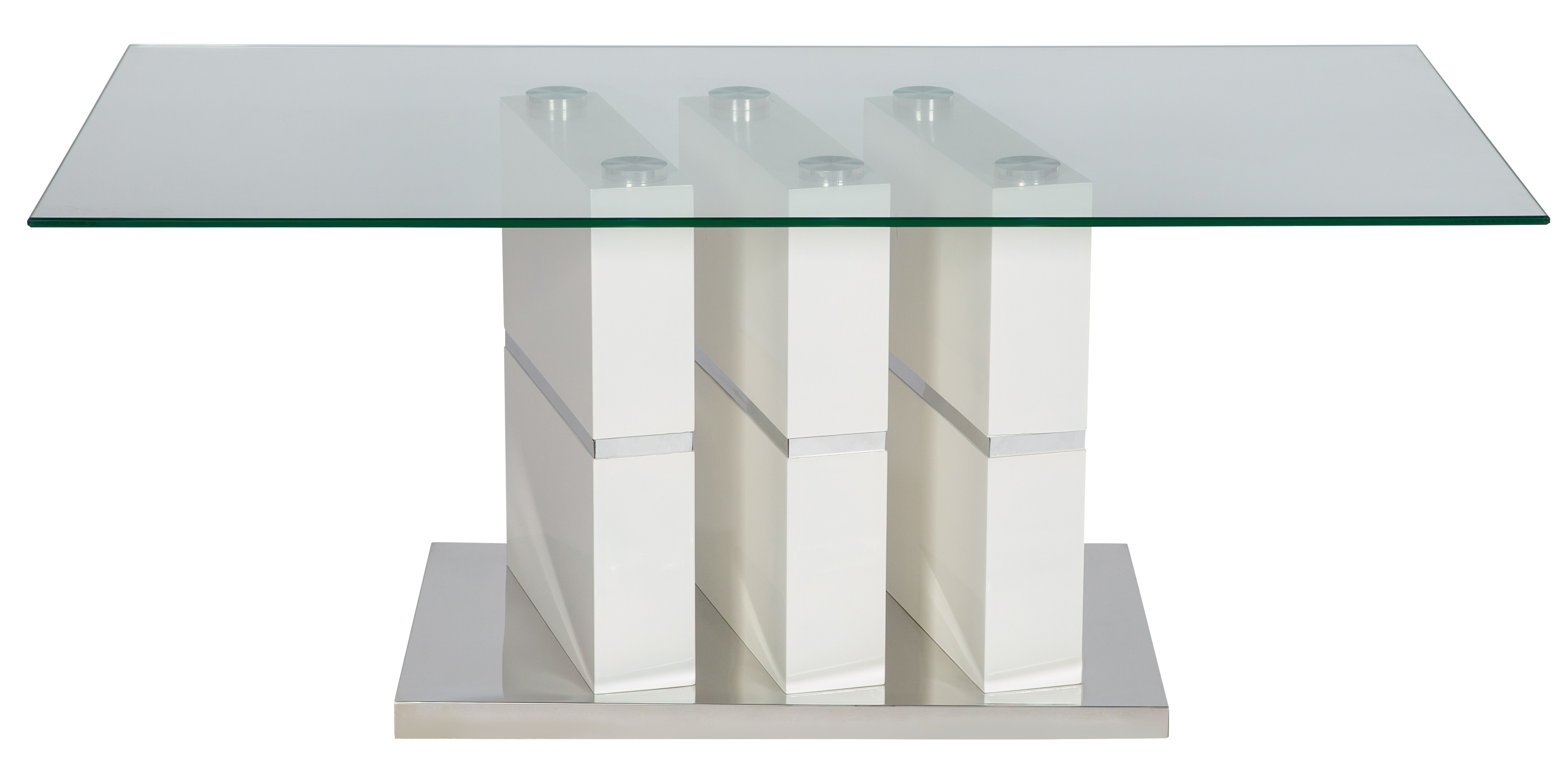 Mesa de Comedor Derick: Tapa Cristal, Pedestal MDF Blanco Brillante, Base Cromada